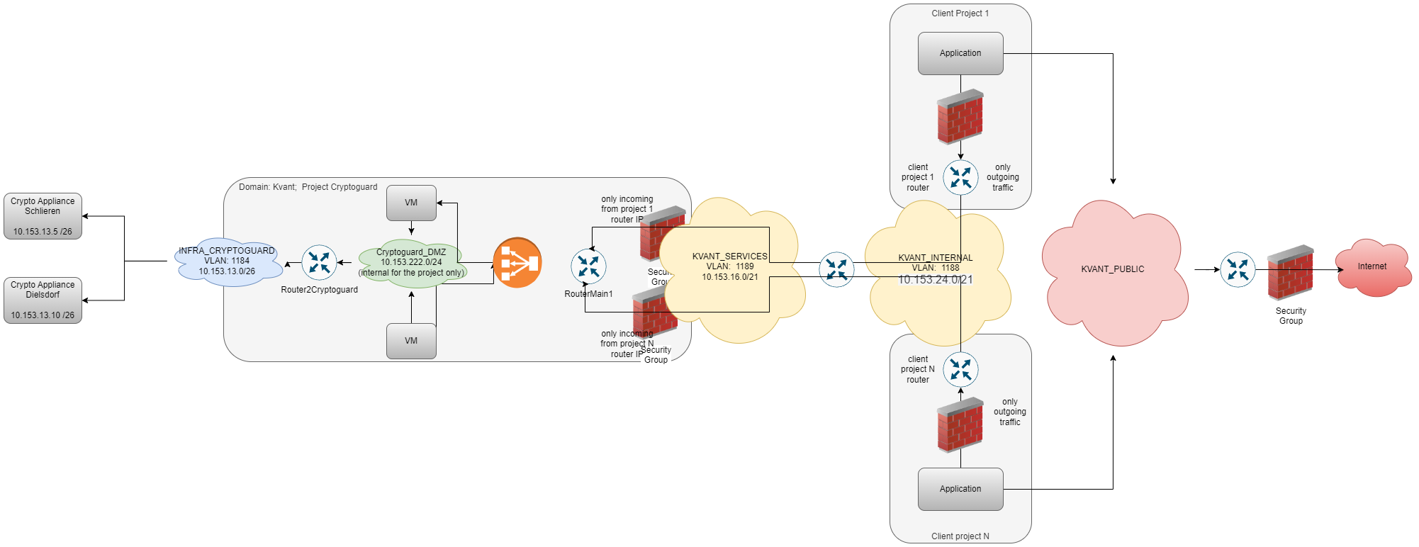 • External (infra and CoLocation) - these are special networks needed when accessing infrastructure elements within Phoeniqs. For example to access HW devices such as LPARs not managed by Openstack.